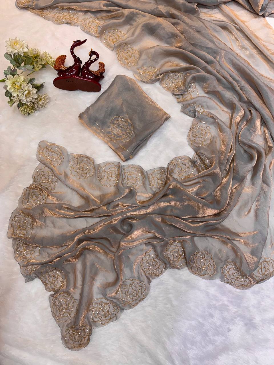 Elevate your wardrobe with this exquisite handwork designer saree, meticulously crafted with intricate detailing. The stunning color palette follows current fashion trends while maintaining timeless appeal. Each stitch represents superior artisanship, ensuring you stand out at special occasions. Perfect for those who appreciate authentic craftsmanship and contemporary style. Like a million stars in the sublime sky, delicately handcrafted katdana work brings out the vibrancy of this space silk saree.