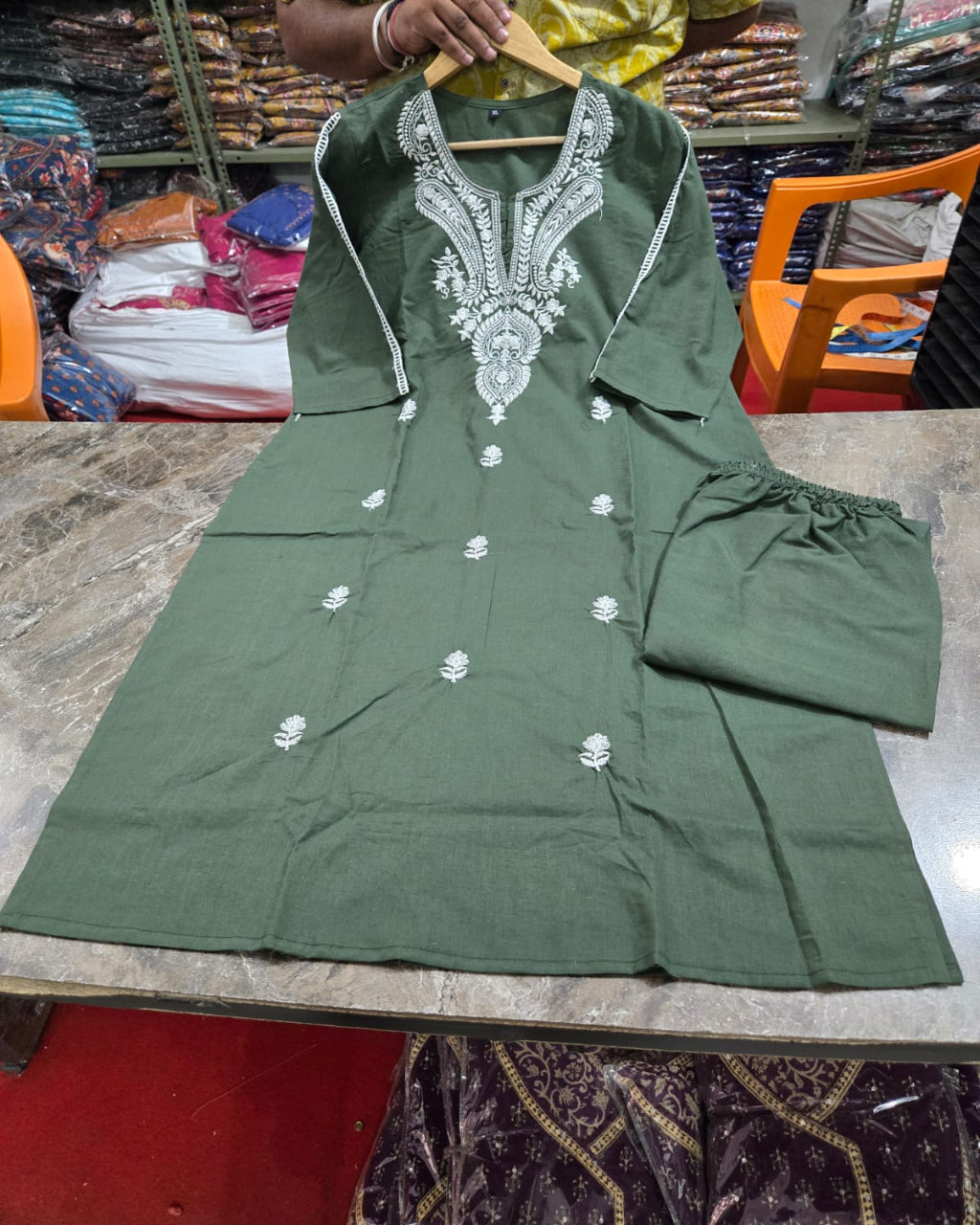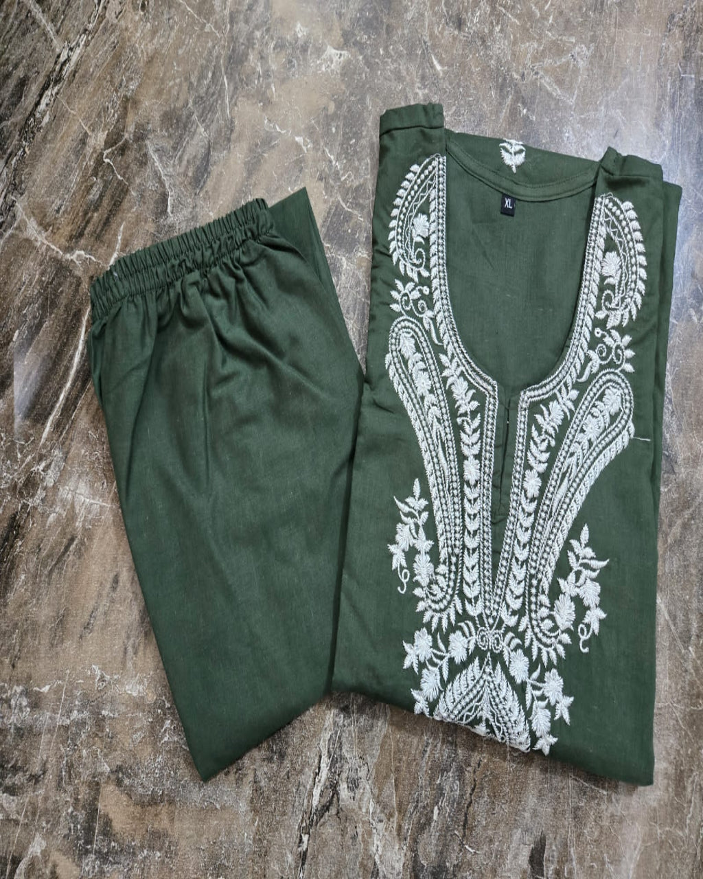 Beautiful Olive Green Cotton Kurta Pant Set
