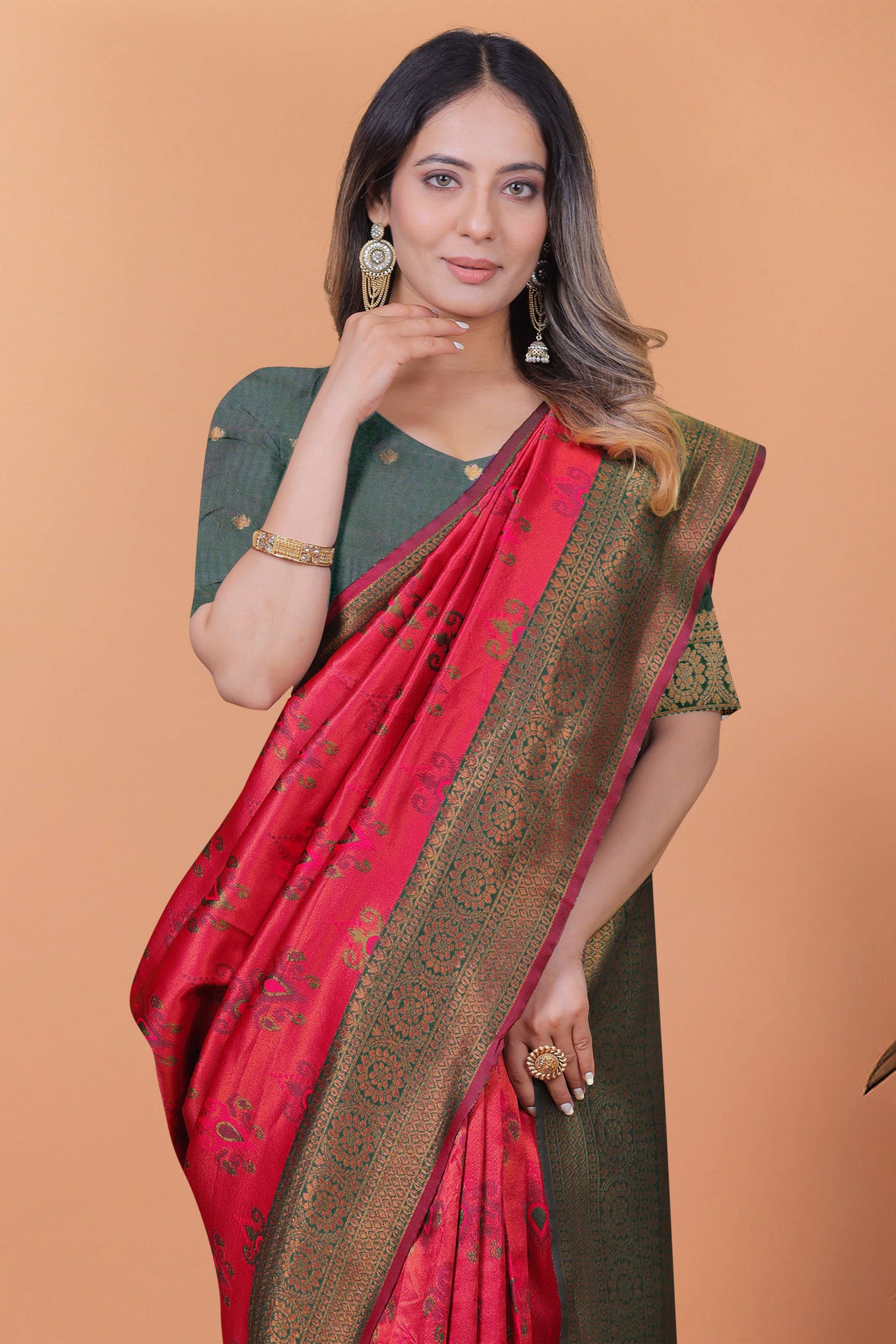 Crimson Majesty Banarasi Silk Saree in Cherry Red & Bottle Green with Zari Work | Wedding, Festive & Traditional Ethnic Wear