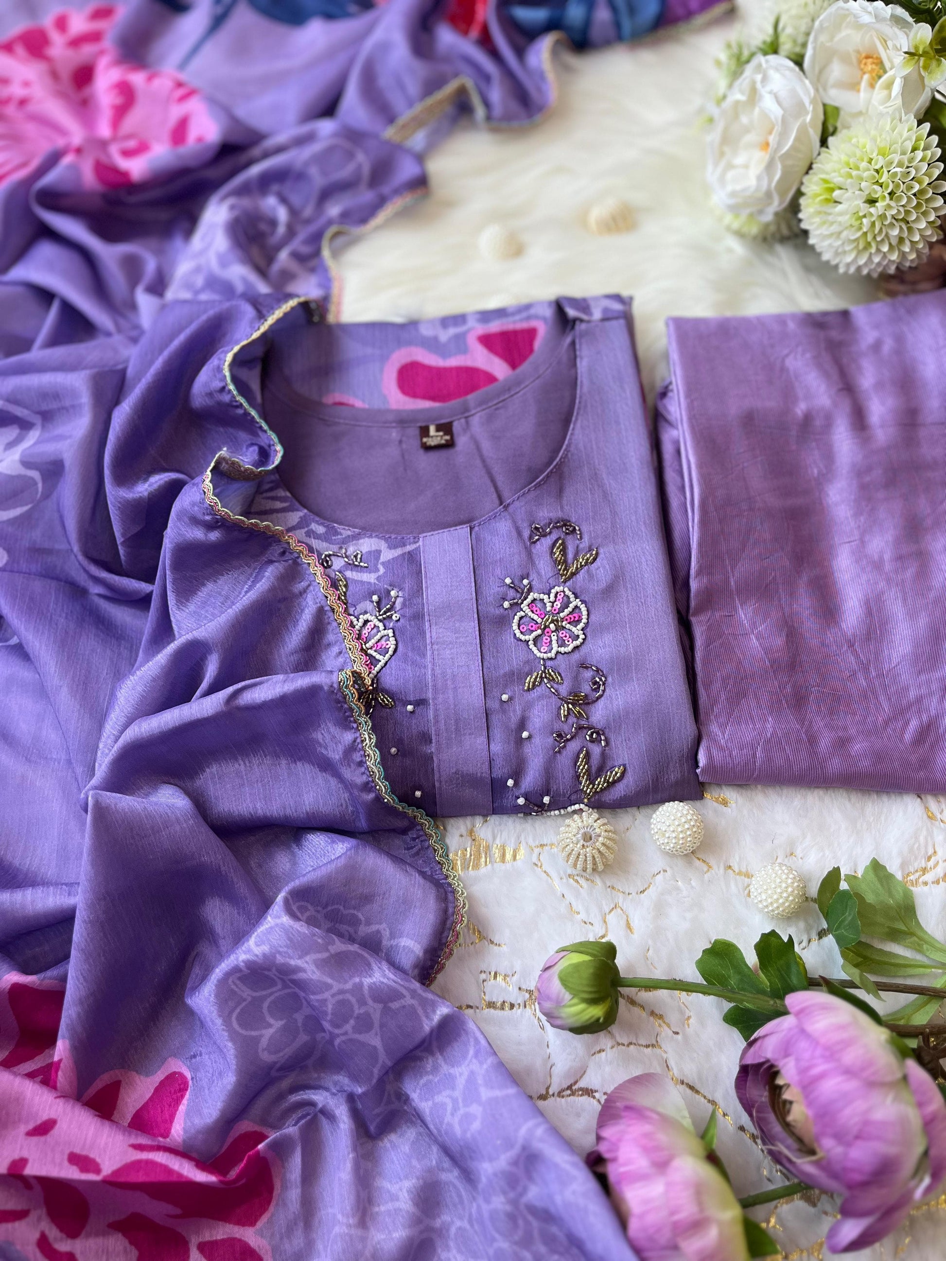 Meticulously crafted from premium Chinon fabric, this Elegant Three Piece Kurta Set delivers exceptional comfort with its smooth, soft texture. The distinguished hand-applied pearl and moti embellishments showcase authentic artisanal craftsmanship, elevating this versatile ensemble to suit both formal gatherings and festive celebrations with refined sophistication.