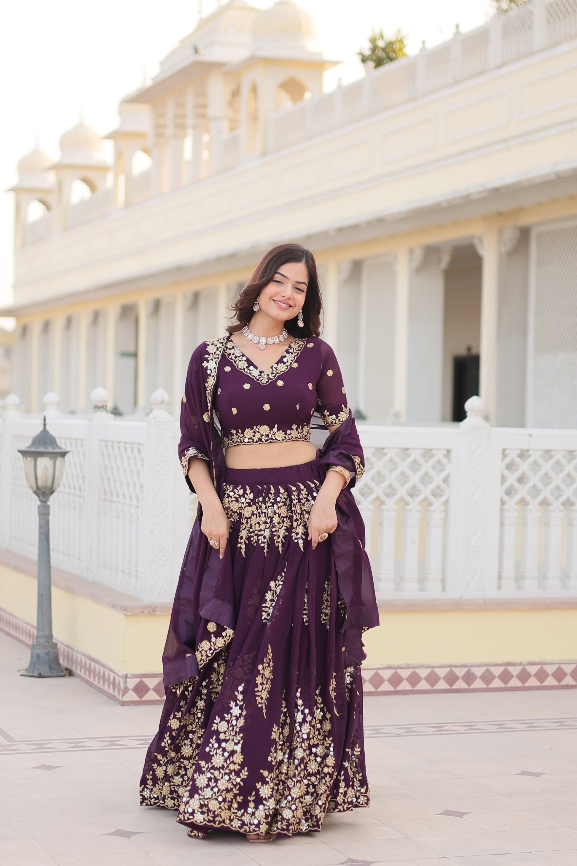 Embroidered Wine Fully Flaired Georgette Lehenga Set