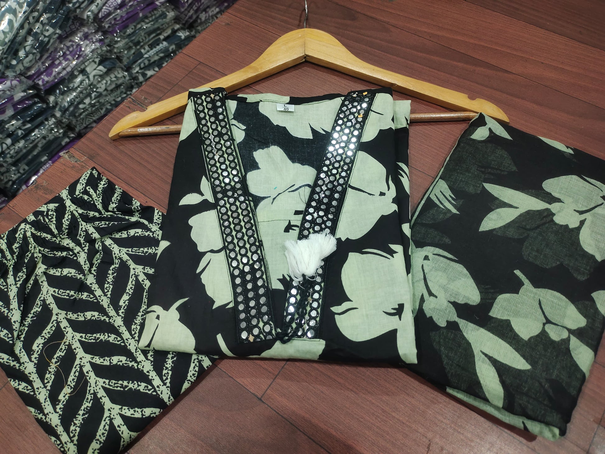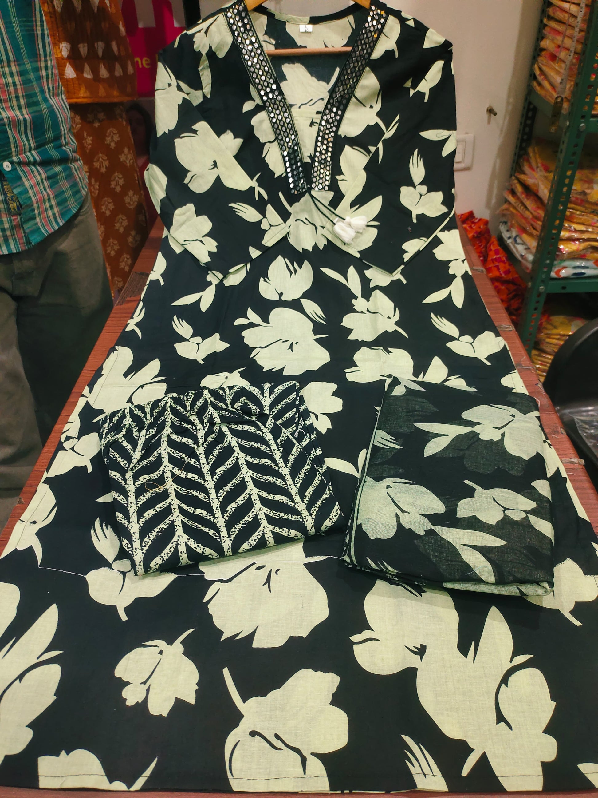 Elevate your wardrobe with this Designer Yellow Floral Cotton Suit Set featuring exquisite Mughal/Kalamkari fusion prints. Crafted from premium fine cotton for exceptional comfort and durability. The kurti is adorned with intricate mirror work at the neckline, creating a stunning focal point. This complete ensemble includes a coordinated kurti, pant, and dupatta—perfect for both casual gatherings and special occasions.