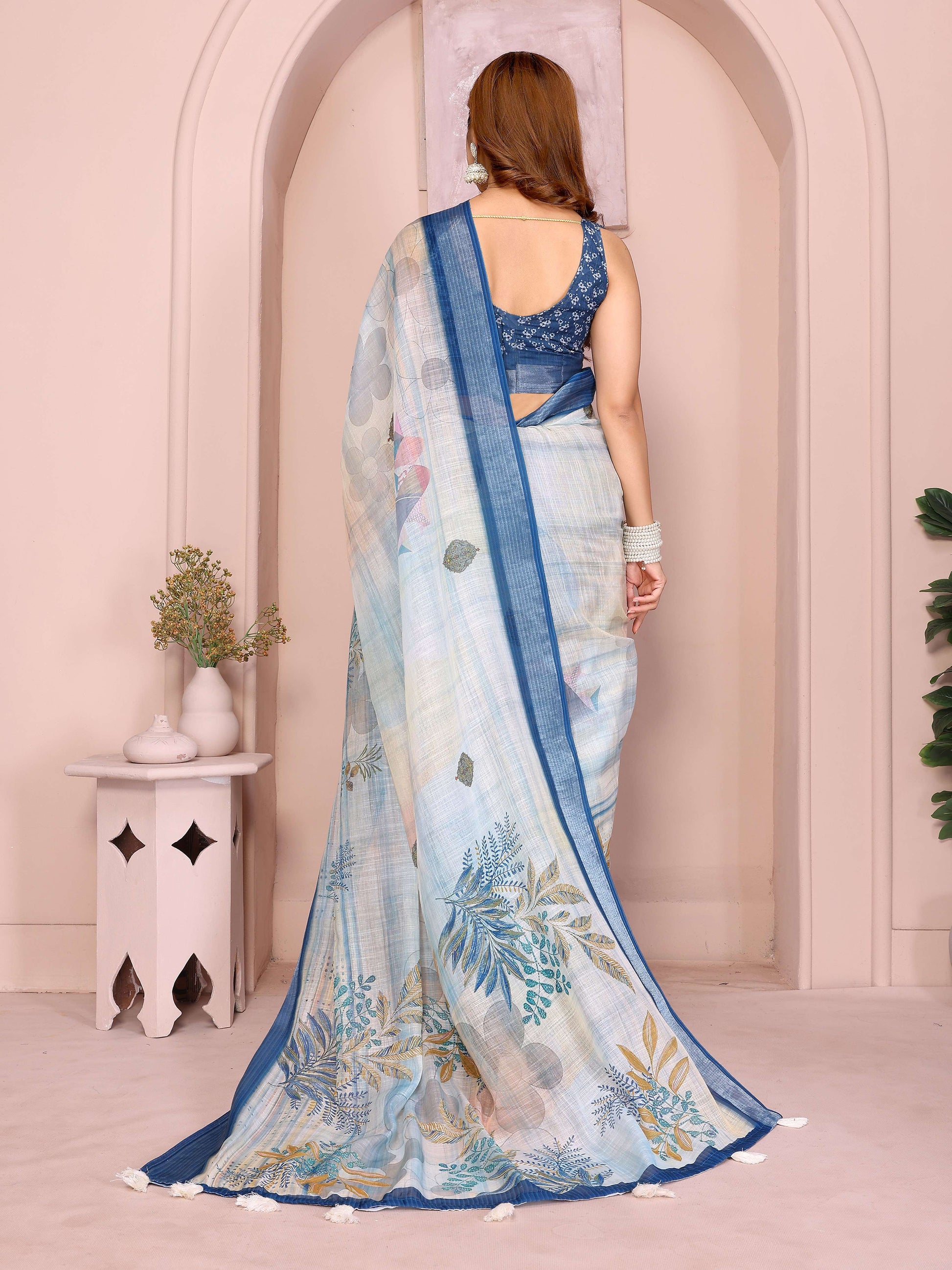 Pastel Blue Linen Cotton Saree with Tropical Leaf Prints & Tassel Pallu