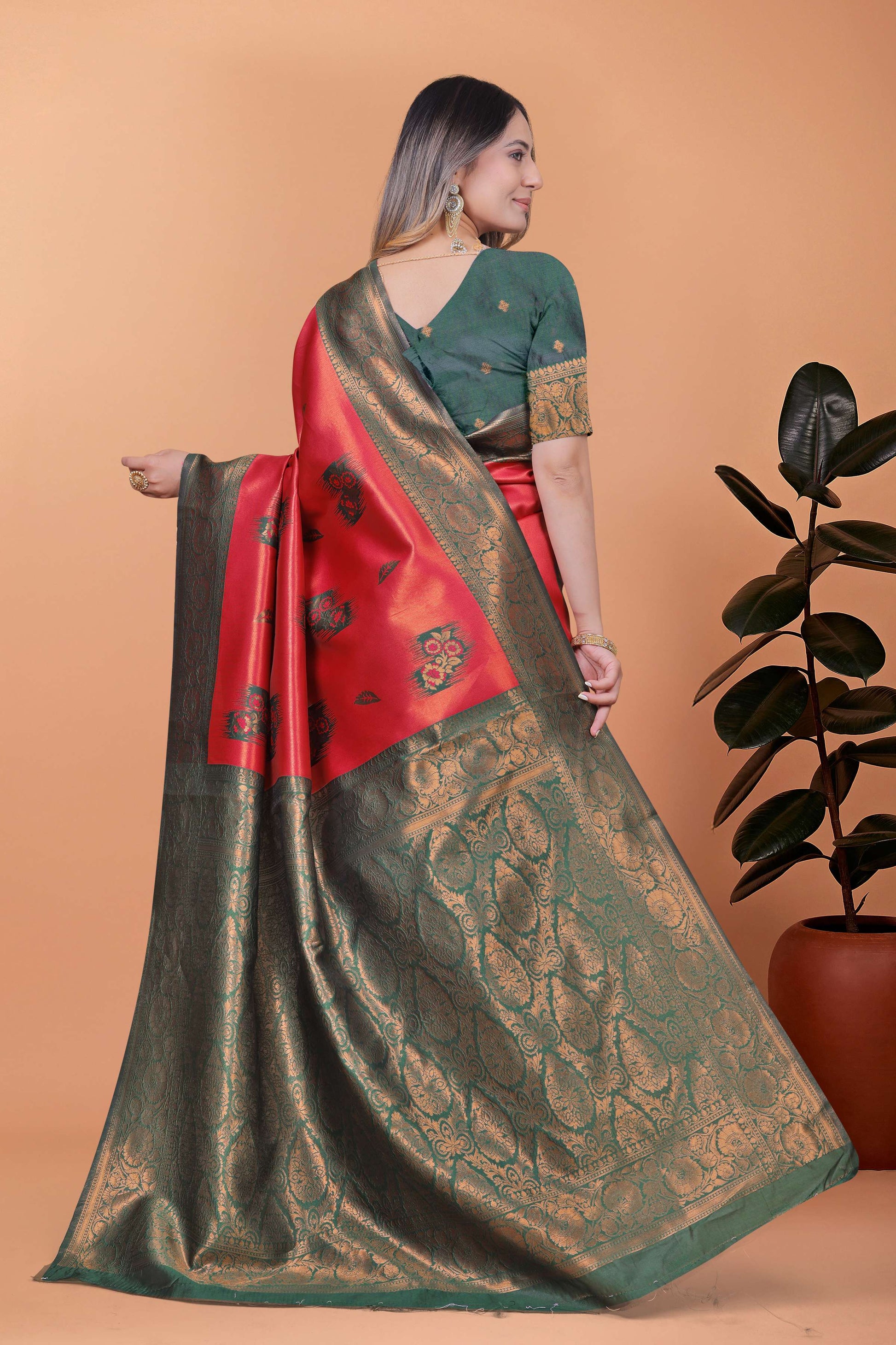 Red & Bottle Green Banarasi Silk Saree with Antique Gold Zari | Traditional Wedding & Festive Saree with Rich Pallu