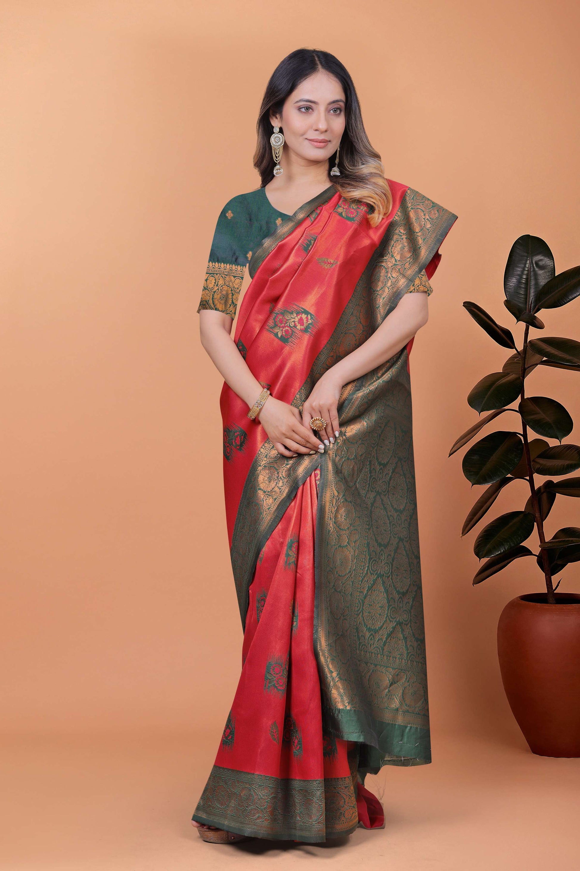 Make a regal statement in this Red & Bottle Green Banarasi Silk Saree, where tradition meets elegance. The vibrant red silk body is adorned with delicate antique gold zari floral motifs, creating a luxurious and festive appeal.