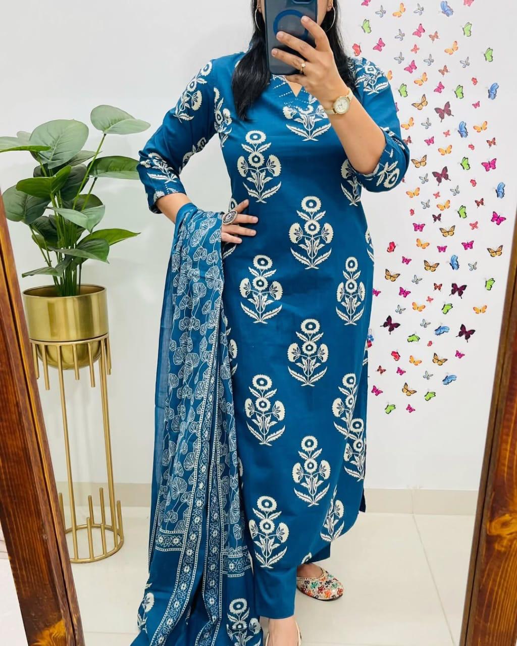 Royal Blue Floral Kurta Pant and Dupatta Set