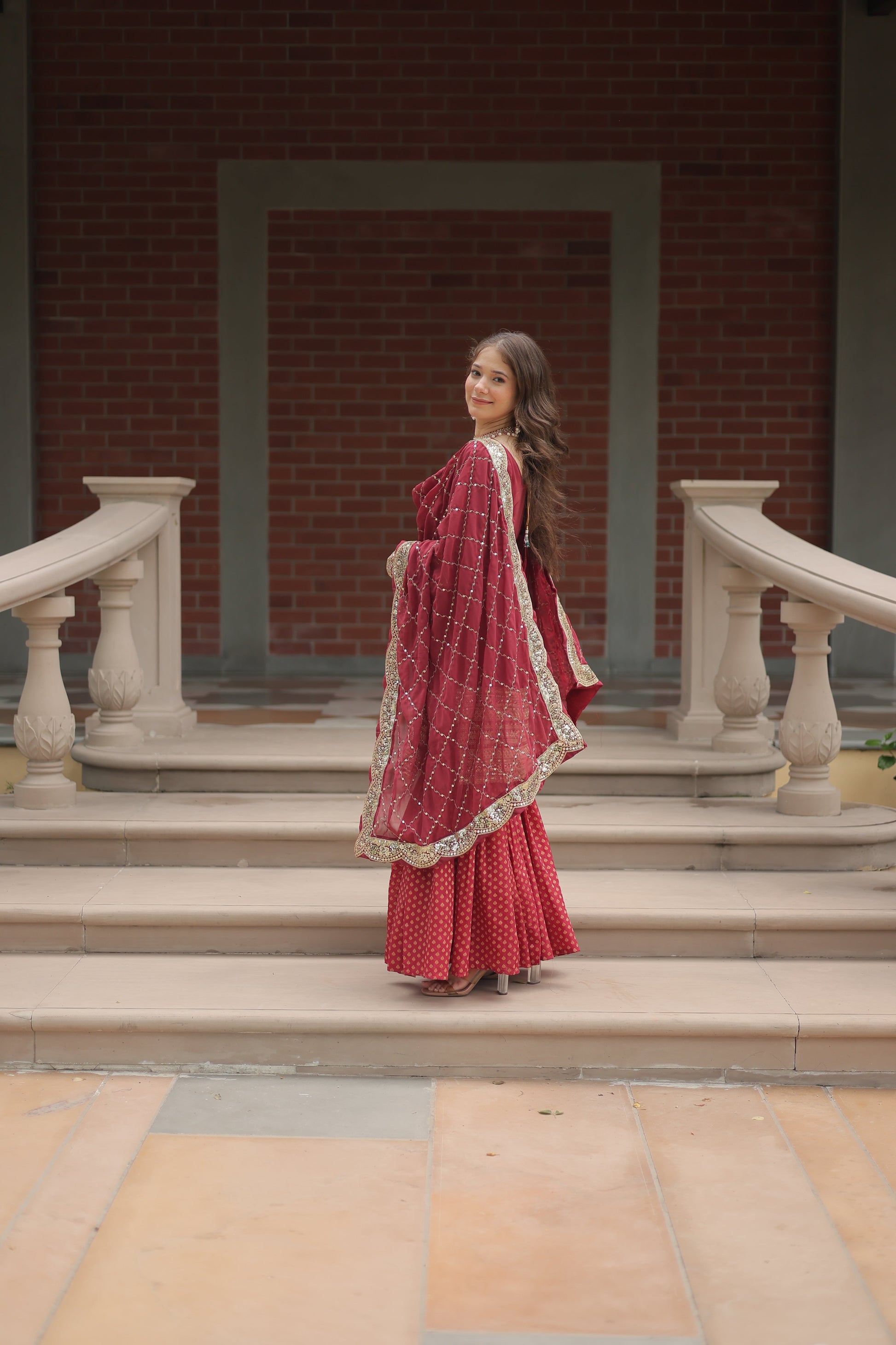 Kurti: Fabric & Work: Faux Georgette with sequins and thread embroidered work, which adds a touch of shimmer and texture, making it look elegant and festive. Sleeves: Full sleeves, matching the photo, adding a classic touch of sophistication. Length: 34 inches, giving it a mid-length, modern kurti look. Lining: Full cotton inner lining for comfort and to ensure a smooth fit. Neck: Designer square neck, which gives a unique, flattering look. Stitching: Standard stitching, offering durability and comfort. Sharara: Fabric & Work: Dayble Viscose Jacquard, a smooth, rich fabric that complements the kurti beautifully. Length: 42 inches, a perfect length for a sharara that provides volume and flow. Lining: Full cotton inner lining for comfort and opacity. Stitching: Elastic waist with standard stitching, making it easy to wear and comfortable. Dupatta: Fabric & Work: Faux Georgette with sequins embroidered arco cutwork and lace border, adding a delicate and luxurious touch to the set. Length: 2.30 meters, giving plenty of length for draping |