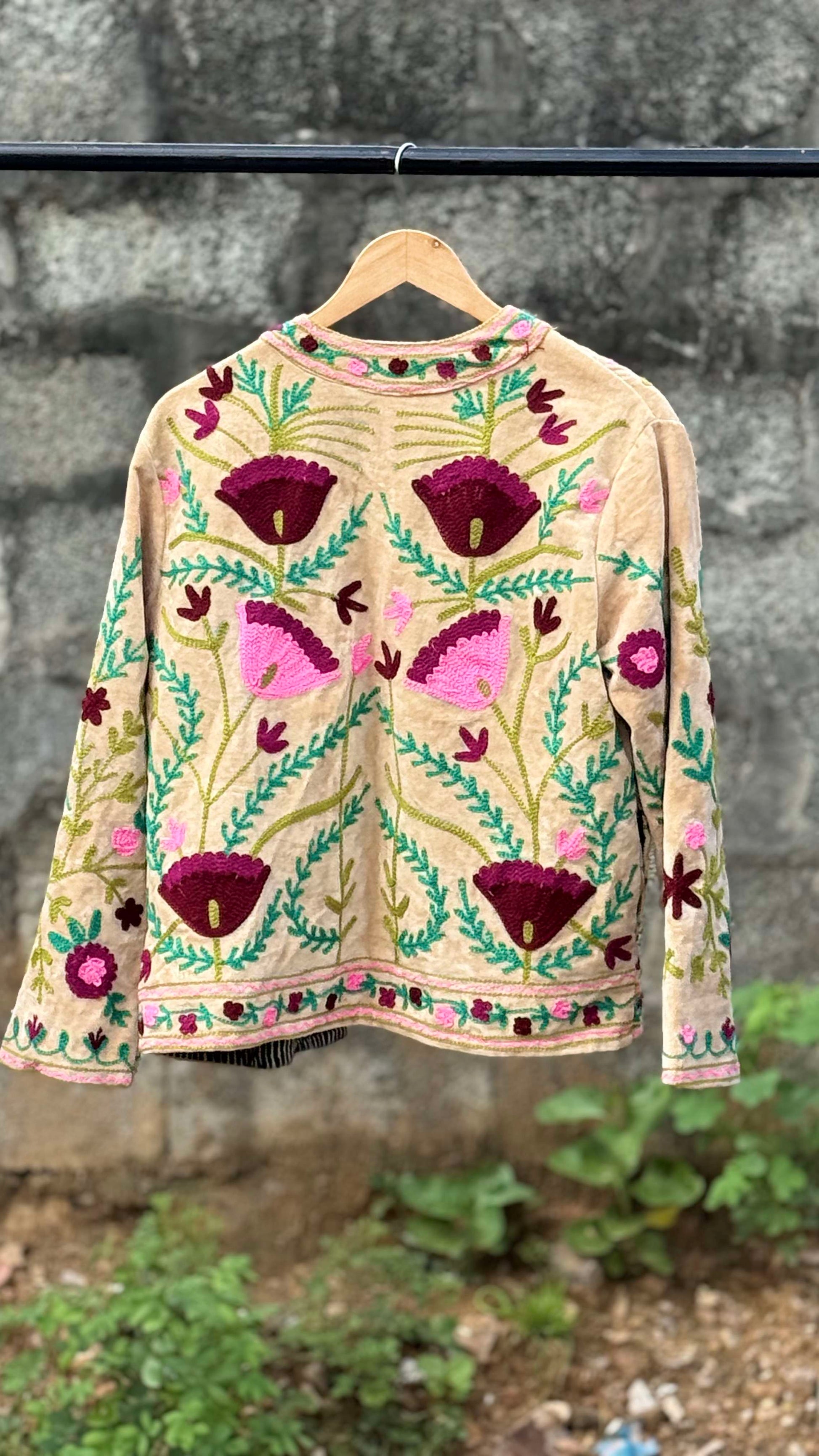 Womens Light Beige Velvet Embroidered Jacket with Floral Design