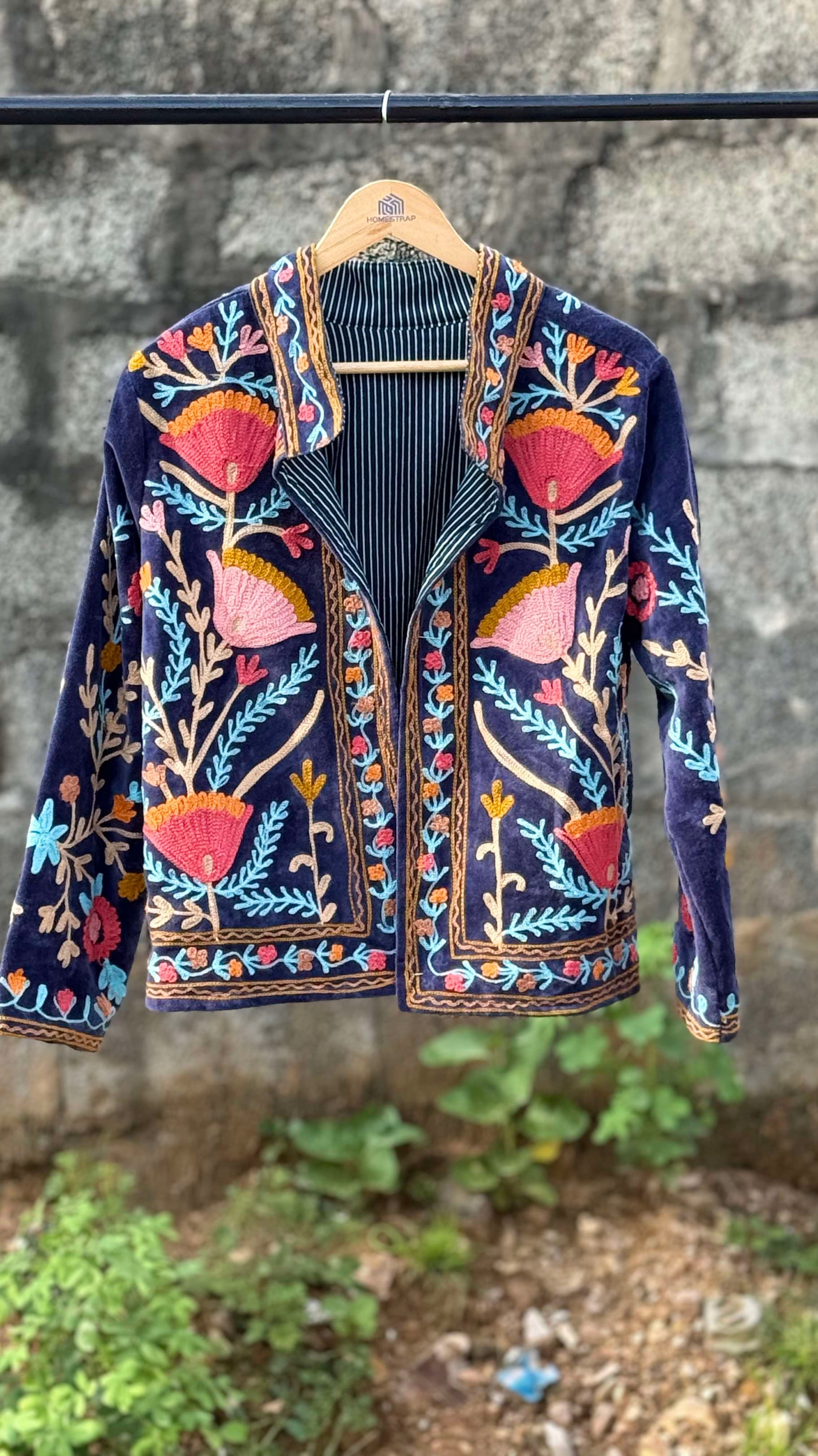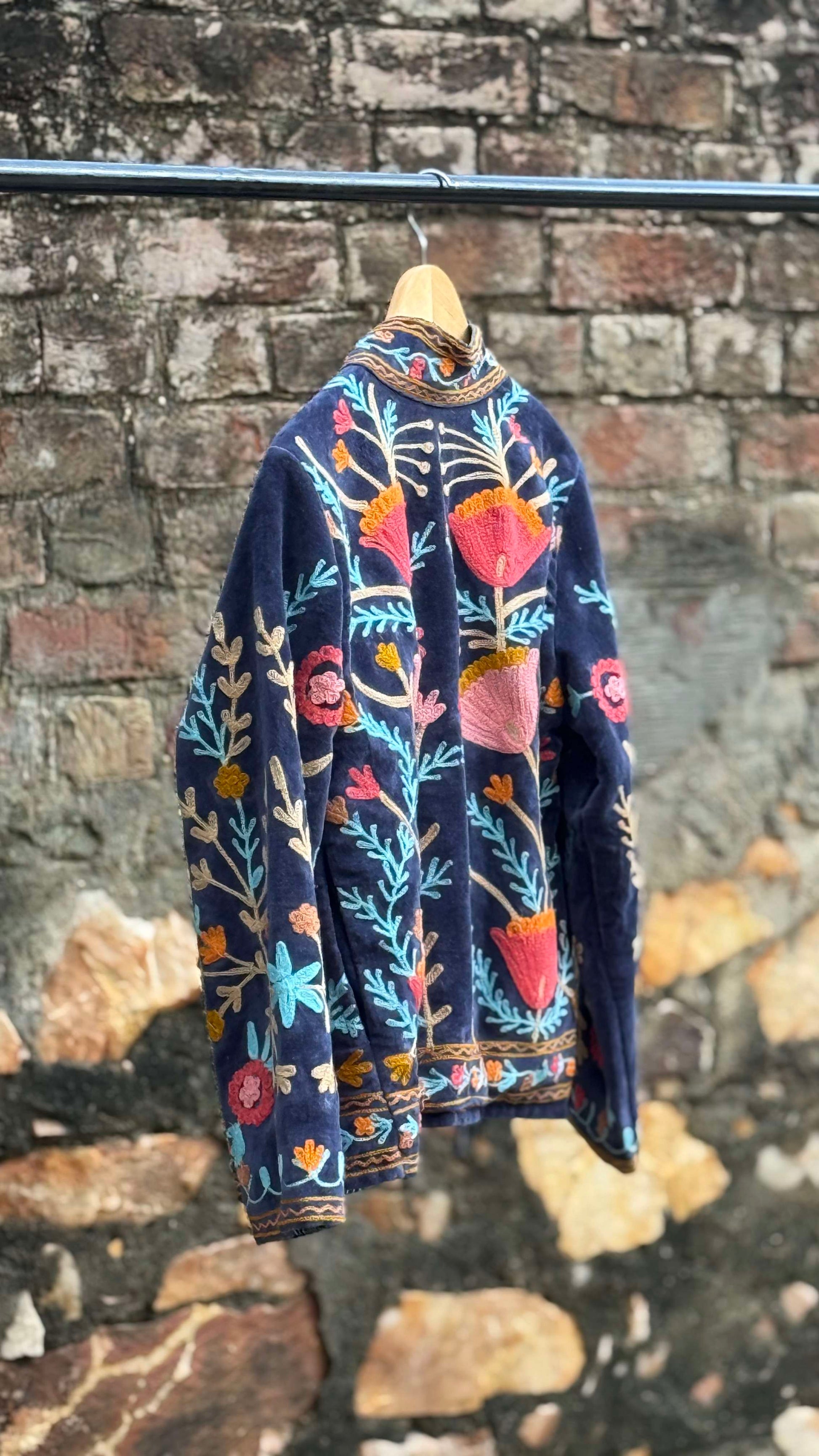 Womens Navy Blue Velvet Embroidered Jacket with Floral Design
